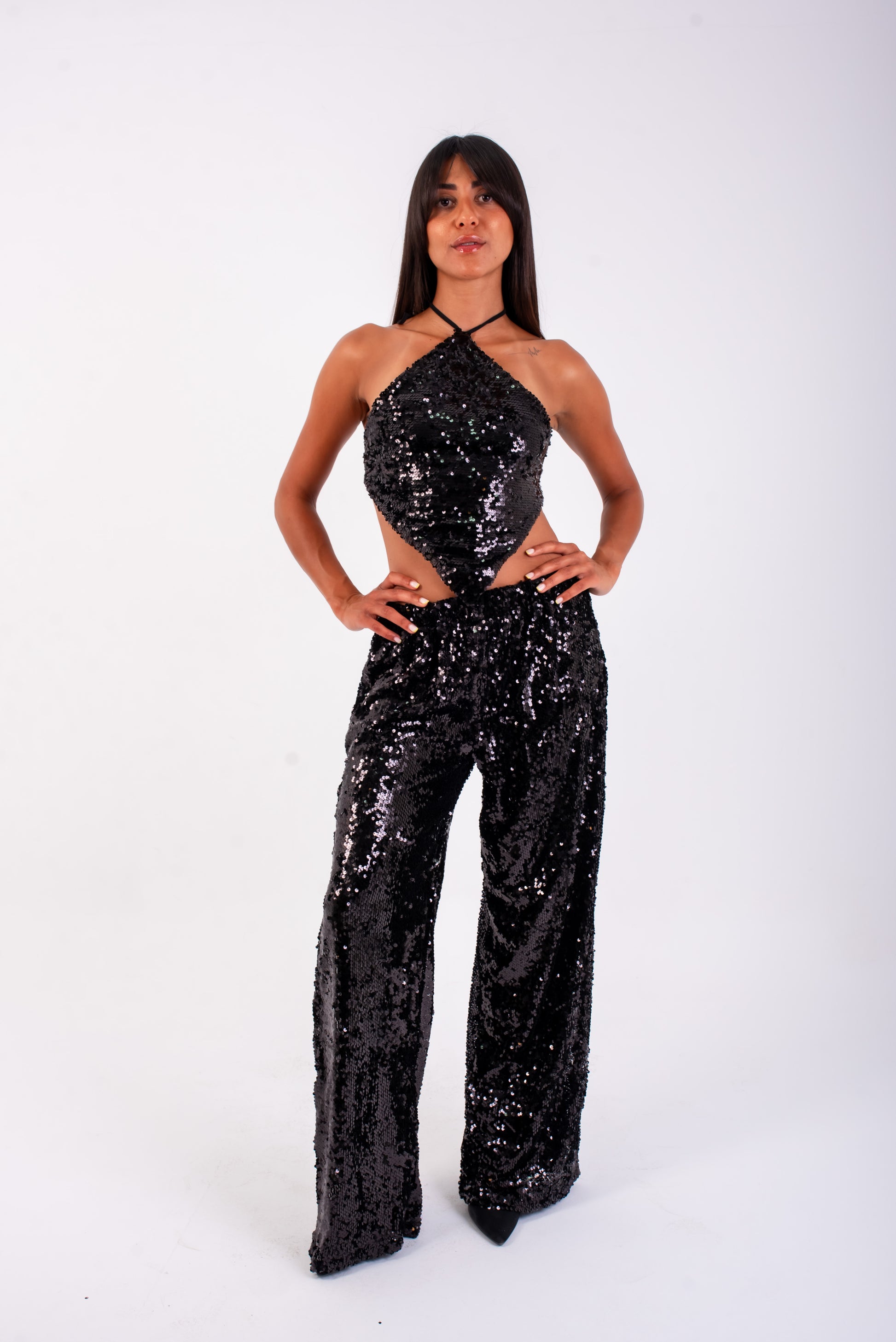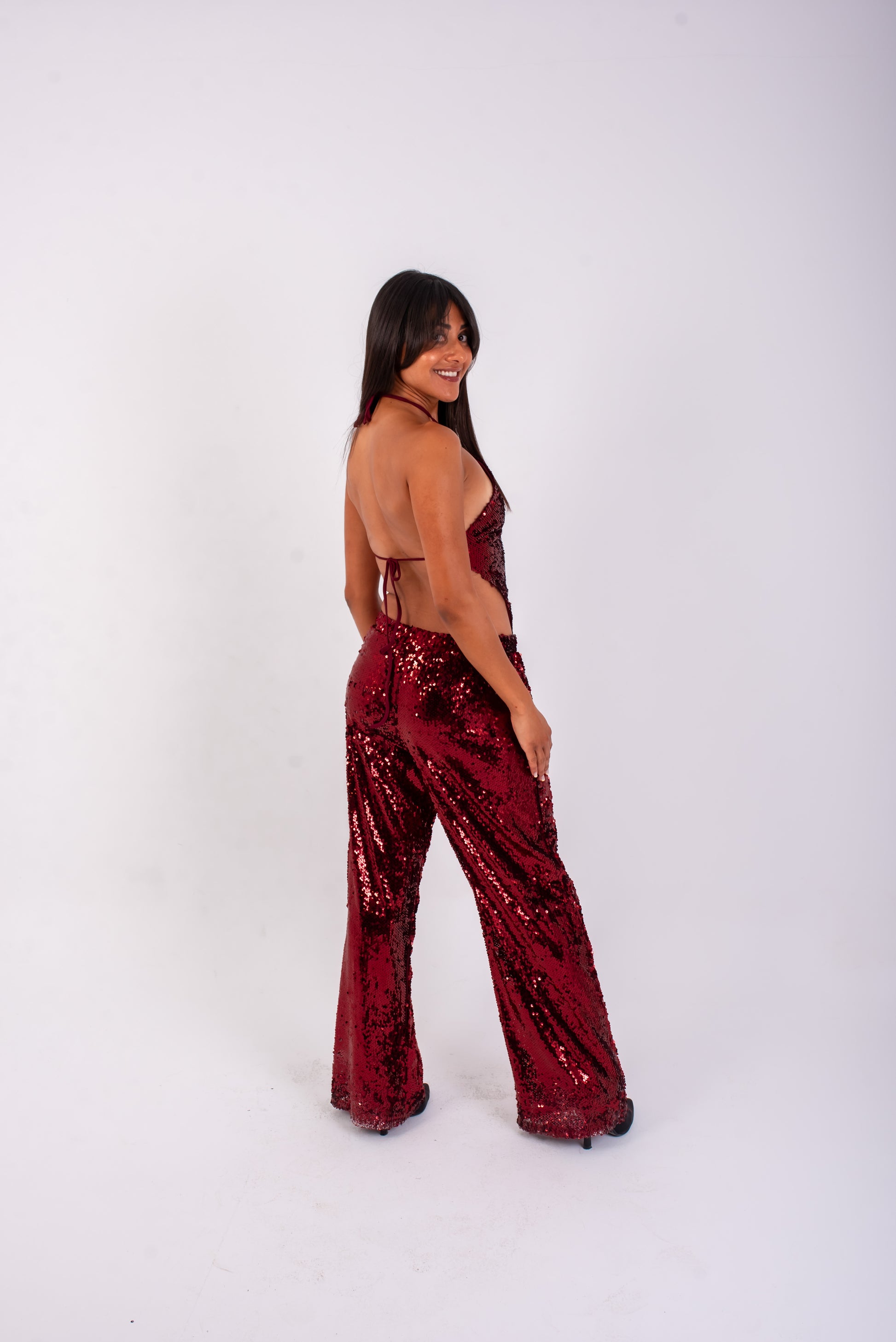 Two piece set with an adjustable backless top and straight leg over-sized pants.